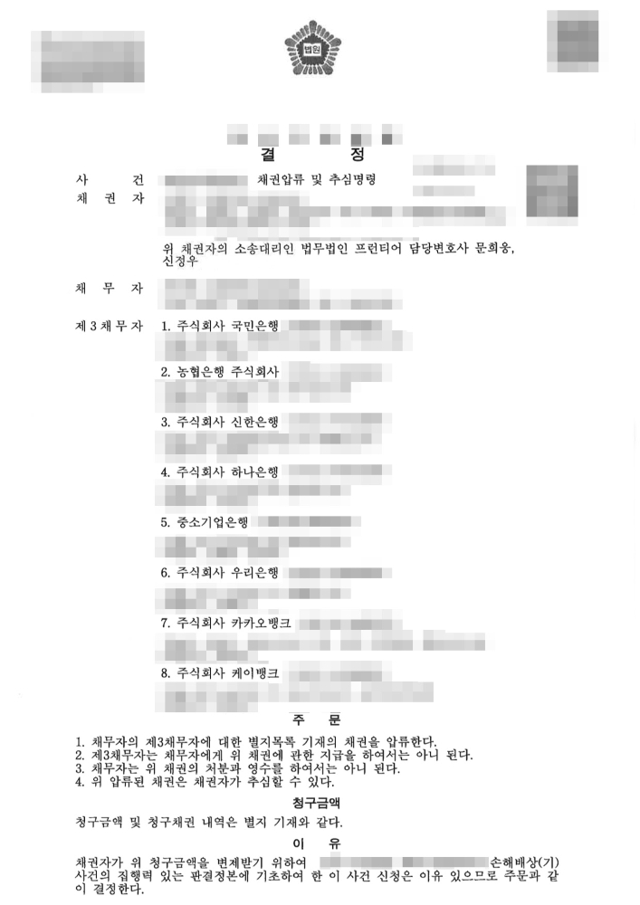 채권자가 채무자로부터 최종적으로 받아야 할 청구금액은 법원이 인정한 원금을 비롯하여, 채무 발생일부터 채권 회수 시점까지 발생한 지연이자, 그리고 이번 압류 및 추심명령을 신청하며 발생한 집행비용을 모두 합산한 금액이었습니다. 이처럼 큰 금액을 신속하고 확실하게 회수하기 위해 채권자는 채무자의 주요 자산인 은행 예금채권을 대상으로 법원에 채권압류 및 추심명령을 신청했습니다.