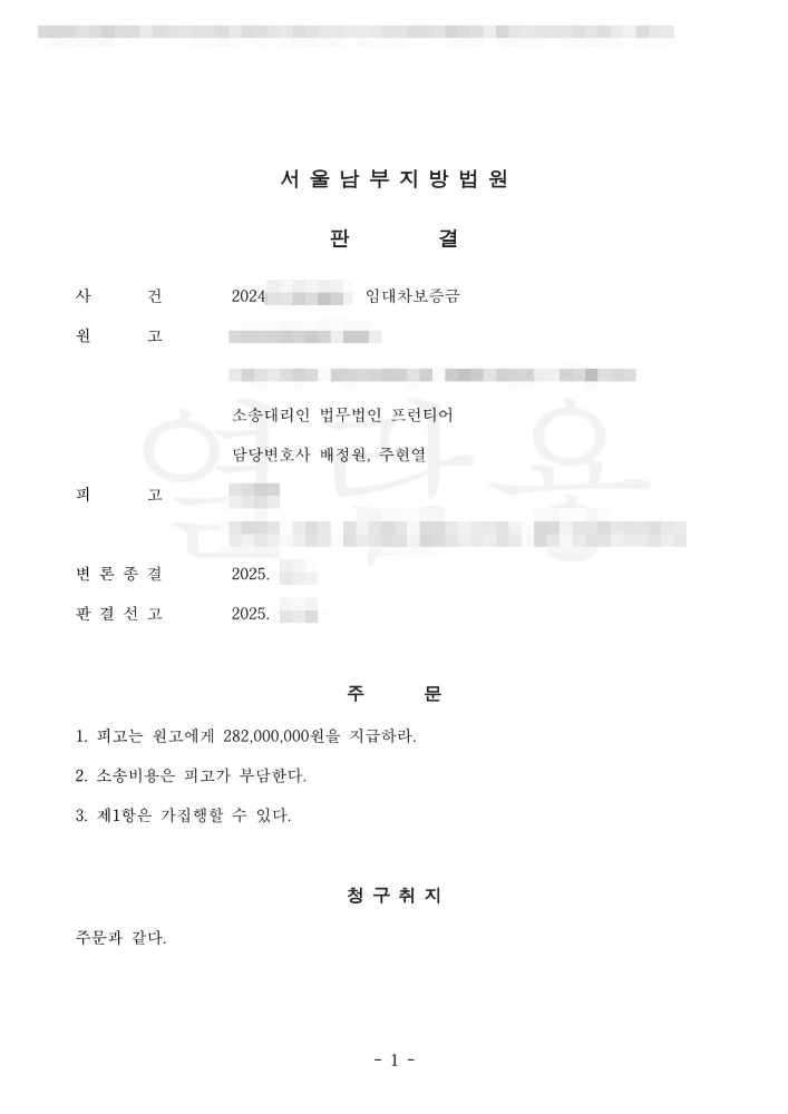 이 사건 원고(임차인)는 계약 체결 무렵 피고(임대인)에게 보증금 2억 8천 2백만 원을 모두 지급했습니다. 계약기간이 만료된 후, 원고는 이 사건 임대차계약 해지 통보를 하였으나, 피고가 보증금을 반환하지 않자, 원고는 법원에 소송을 제기하게 되었습니다. 원고 측 소송대리인으로는 법무법인 프런티어 소속 서울민사소송변호사인 배정원 변호사가 선임되어 사건을 대리하였습니다.