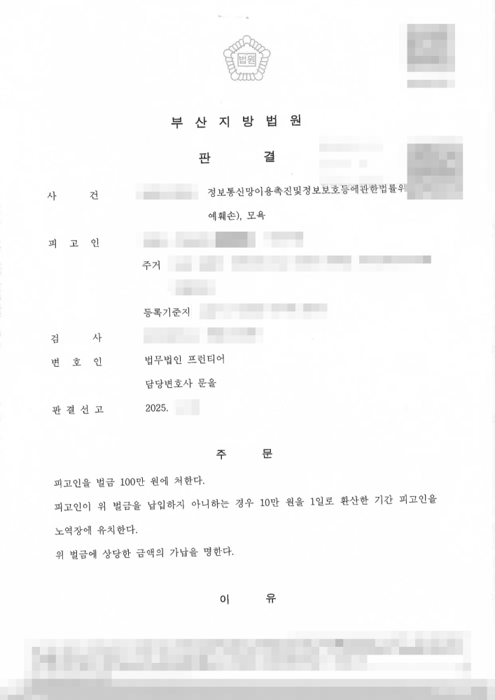 이러한 적극적인 법리 주장과 양형 변론 덕분에, 법원은 피고인에게 징역형이 아닌 벌금 100만 원을 선고하며 사건을 마무리 지었습니다. 부산모욕죄변호사의 조력이 없었다면 실형 또는 훨씬 무거운 벌금형에 처해질 가능성이 높았던 사안입니다.