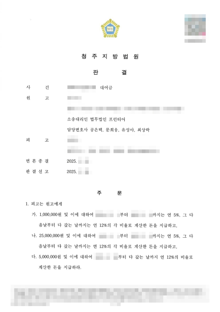 청주지방법원은 원고 측의 청구를 주문과 같이 전부 인용하는 판결을 선고했습니다. 이는 천안대여금변호사가 제시한 증거와 변제기 도과 및 이행 거절에 대한 논리가 법원에서 완전히 받아들여졌음을 의미합니다.