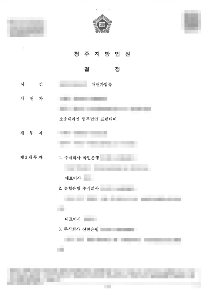 법원의 인용 결정 및 송달: 법원은 위 소명과 담보 제공이 완료되자 곧바로 채권가압류 결정을 내리고, 이 결정문은 채무자와 7개 제3채무자 은행에 송달됩니다. 제3채무자는 이 결정문을 송달받는 즉시 채무자에게 해당 예금의 지급을 금지해야 할 법적 의무를 지게 됩니다.