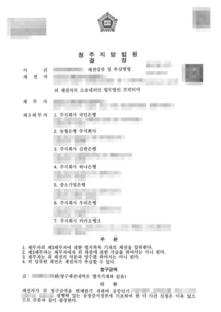 청주변호사사무실이 채권자를 대리하여 채무자에 대한 채권압류 및 추심명령 신청 사건에서 성공적으로 전액 인용 결정을 받은 사안입니다. 이 사건 채권자의 소송대리인으로는 법무법인 프런티어 청주변호사사무실 공은택 변호사가 지정되어 청구 절차를 진행하였습니다.