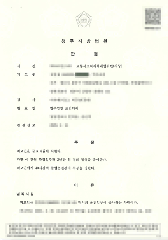 법원은 피고인에게 금고 8월에 집행유예 2년을 선고하였습니다. 아울러 40시간의 준법운전강의 수강을 명하였습니다. 보도 진입으로 세 명의 피해자에게 동시에 상해를 입힌 중대한 사안임에도 불구하고, 피해자들과의 원만한 합의 및 피고인의 진지한 반성, 그리고 청주교통사고변호사의 체계적인 변호 활동이 종합적으로 작용하여 실형을 피하고 집행유예라는 결과를 이끌어낸 것입니다.